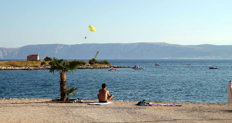 Pogled iz kuće i dvorišta pruža se prema moru i šetnici s plažama dugoj 2 km.